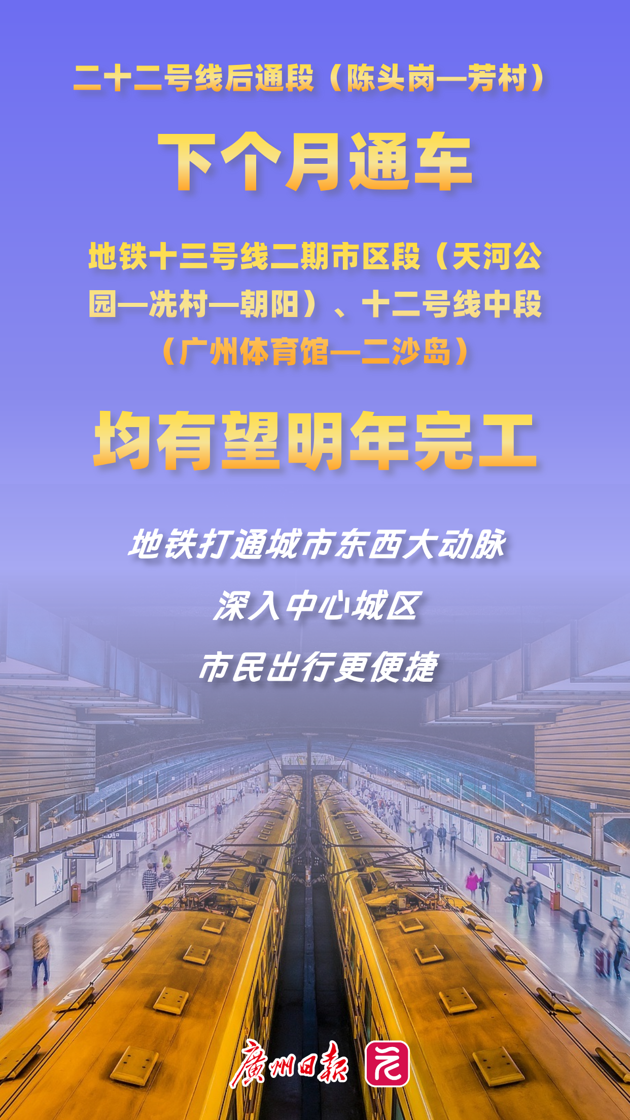 接下来,广州地铁将迎来多条线路的市区段,拉升因近年开通较多外围线路而暂时下滑的客流强度。下个月,二十二号线后通段(陈头岗—芳村)将通车,广州南站可快速通达芳村,接上市区环线,通达性显著提升。明年,地铁十三号线二期市区段(天河公园—冼村—朝阳)、十二号线中段(广州体育馆—二沙岛)均有望完工,打通城市东西大动脉,深入中心城区,换乘多条线路,市民出行更便捷舒适,城市枢纽能级进一步提升。