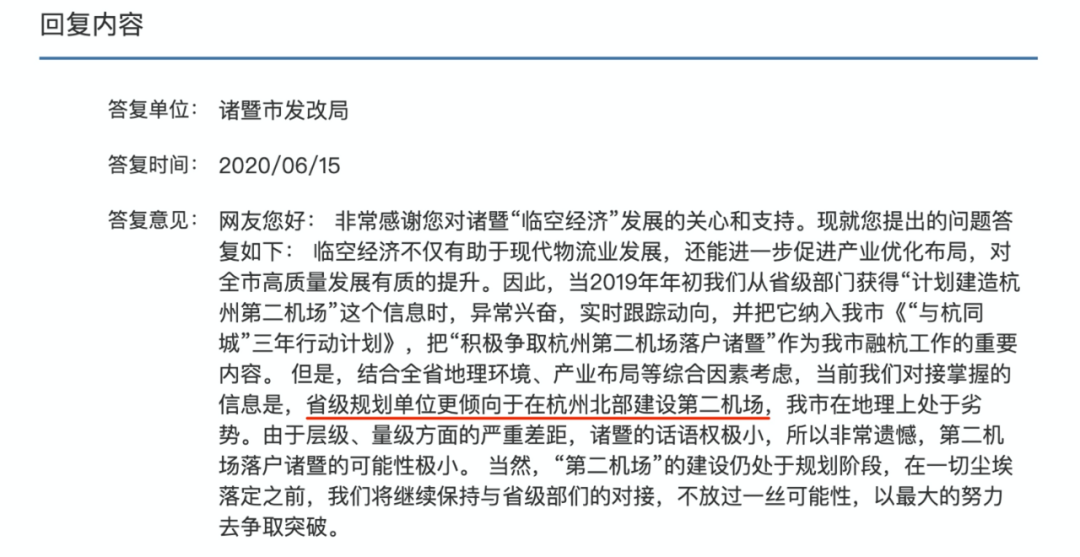当然杭州第二国际机场实际上是“ 杭州都市圈第二机场”,选址也不一定落在杭州市界内。2020年6月,诸暨发改局在回复网友问政中,提到过“省级规划单位更倾向于在杭州北部建设第二机场”。同时,说明“由于地理上处于劣势,层级、量级方面的严重差距,诸暨话语权较小,杭州第二机场落户诸暨的可能性极小。”最终,杭州第二机场选址何处,还需等待正式官方规划落定。
