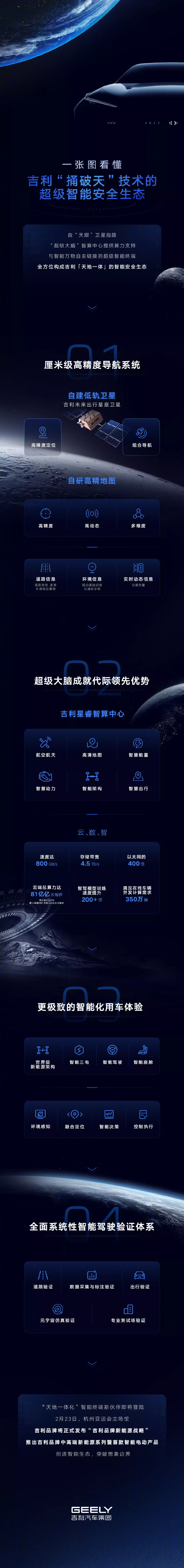 吉利银河首款车定名银河L7,23日全球首发。吉利官方表示,将在“银河”系列车型中配备“捅破天”全方位构成“天地一体化”的智能安全生态。其中包含了厘米级高精度的导航系统,由吉利自建的低轨卫星实现高精度、高动态、多维度的定位,以及组合道路、环境、实时动态信息的导航系统。其次,吉利星睿智算中心和云、数、智能实现 800GB / s 的速度、4.5TB / s 的存储带宽、81 亿亿次每秒的云端总算力等。第三,智能化用车体验将赋予“银河”全新的新能源架构、智能三电、智能座舱等,实现环境感知、融合定位、智能决策以及控制执行。