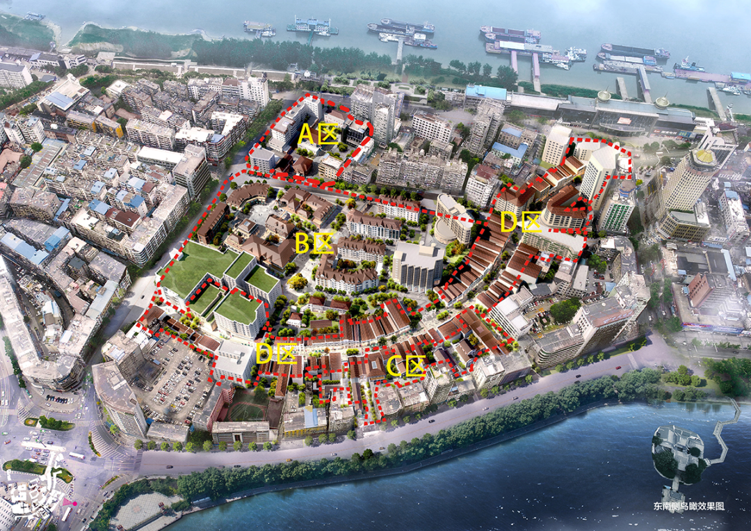 该区域涉及旅游零售、特色体验、餐饮、文化体验、教育服务等。借助老街历史,结合九江非物质文化遗产保护,积极引入传统商业老字号、手工技艺制作及展示、传统曲艺表演、传统医药等功能业态,引入地方特色餐饮、传统文化体验、文化创意等,形成独具九江传统韵味的商业空间。 洋街项目地块及洋街A/B/C/D区平面划分图