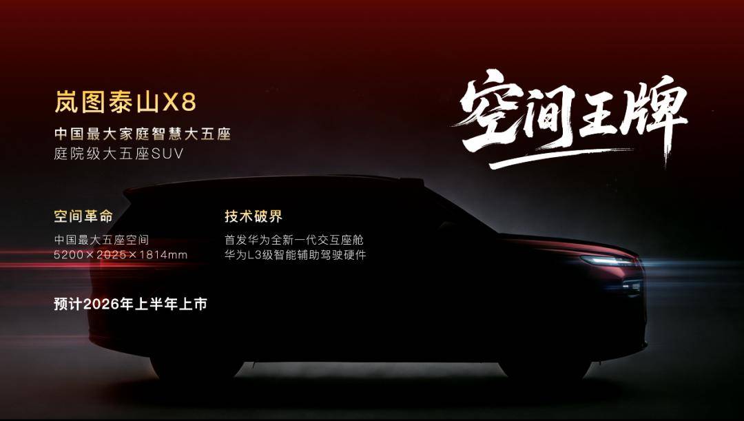 同期推出的岚图泰山X8定位家庭用车市场,车身尺寸为5200mm×2025mm×1814mm,采用五座布局,搭载华为新一代智能座舱系统。该车型定于2026年上半年上市。