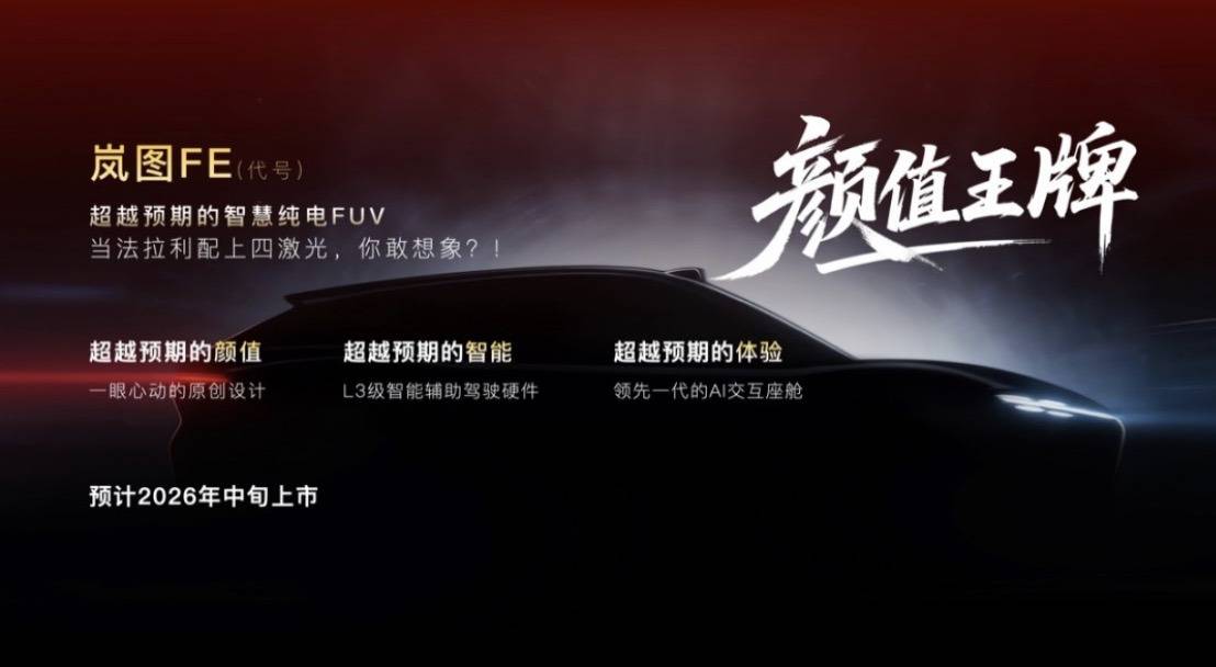 代号“FE”的纯电FUV车型,计划于2026年年中推出,配备四激光雷达感知系统及AI交互智能座舱,主打个性化设计。该车型是岚图与华为乾崑合作的新起点,目标用户为年轻消费群体。