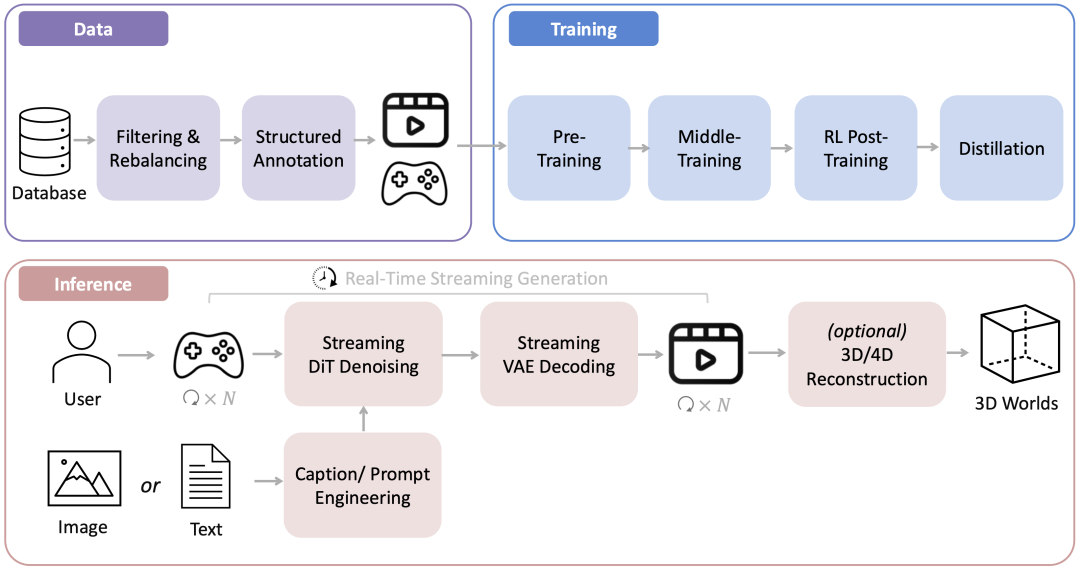今日,腾讯混元世界模型 1.5(Tencent HY WorldPlay) 正式发布。官方称,混元世界模型 1.5(WorldPlay)首次开源了业界最系统、最全面的实时世界模型框架,涵盖数据、训练、流式推理部署等全链路、全环节,并提出了重构记忆力、长上下文蒸馏、基于 3D 的自回归扩散模型强化学习等算法模块。
