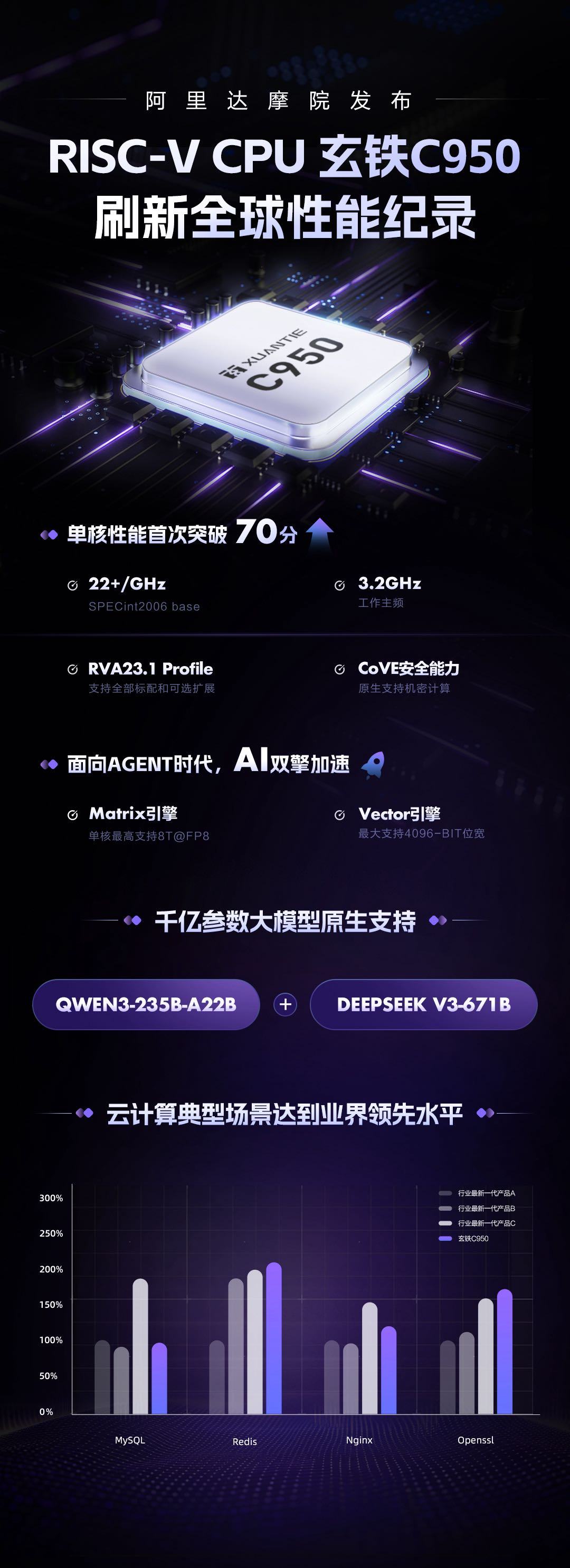 AI Agent时代也给服务器CPU带来全新机遇。会上,达摩院发布了两款RISC-V原生AI计算引擎——Vector加速引擎和Matrix加速引擎,与玄铁CPU统一编址,将通用高性能算力与AI算力融合,流畅运行Qwen3-235B-A22B、DeepSeek V3-671B。这是CPU首次原生支持千亿参数大模型,有望成为AI Agent时代的新型服务器CPU样本。此外,达摩院推出了Flex可扩展平台,提供全套建模、验证环境和工具链,支持芯片设计企业对玄铁CPU自定义修改,打造符合自身场景需求的专属CPU。