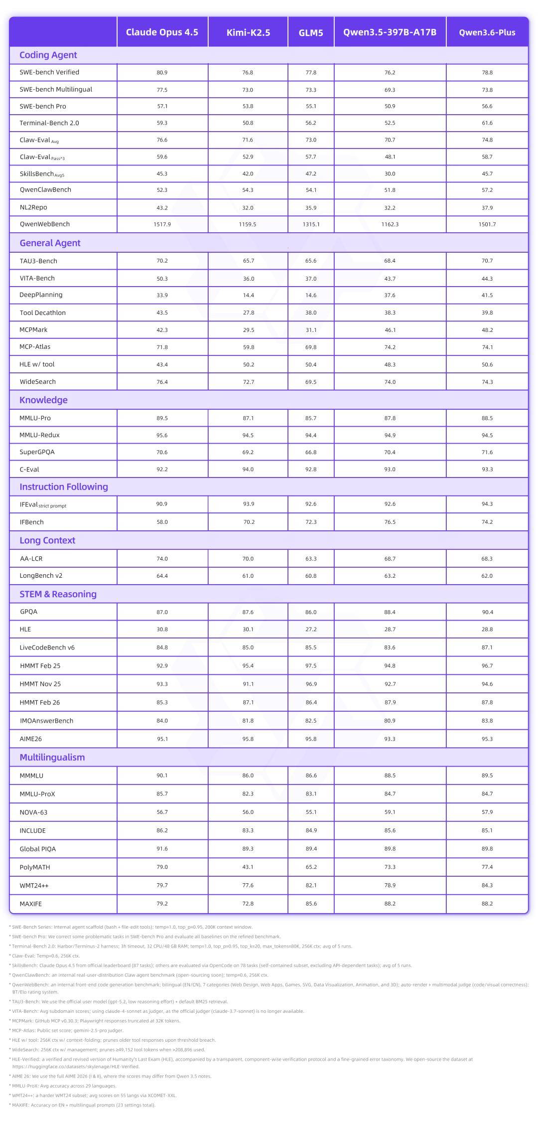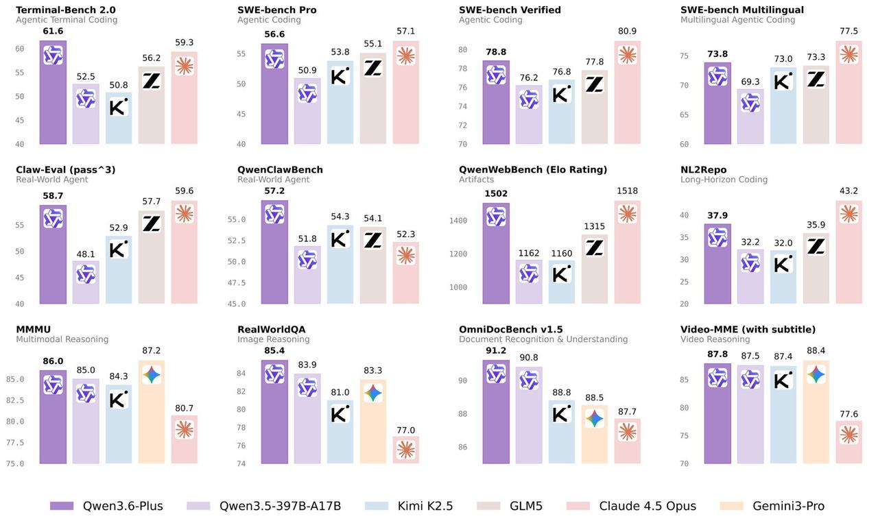 相较于上一代模型,千问3.6整体性能提升明显,尤其是编程Coding能力、智能体Agent能力和工具调用能力都实现了全面跃升。在SWE-bench系列真实编程任务测试、考察终端编程的Terminal-Bench2.0、长程编程任务NL2Repo,以及Claw-Eval、QwenClawBench等真实世界Agent能力评测中,Qwen3.6-Plus表现可完全匹敌Claude Opus 4.5,并显著超越了2倍乃至3倍其参数的GLM-5、Kimi-K2.5等国产模型。