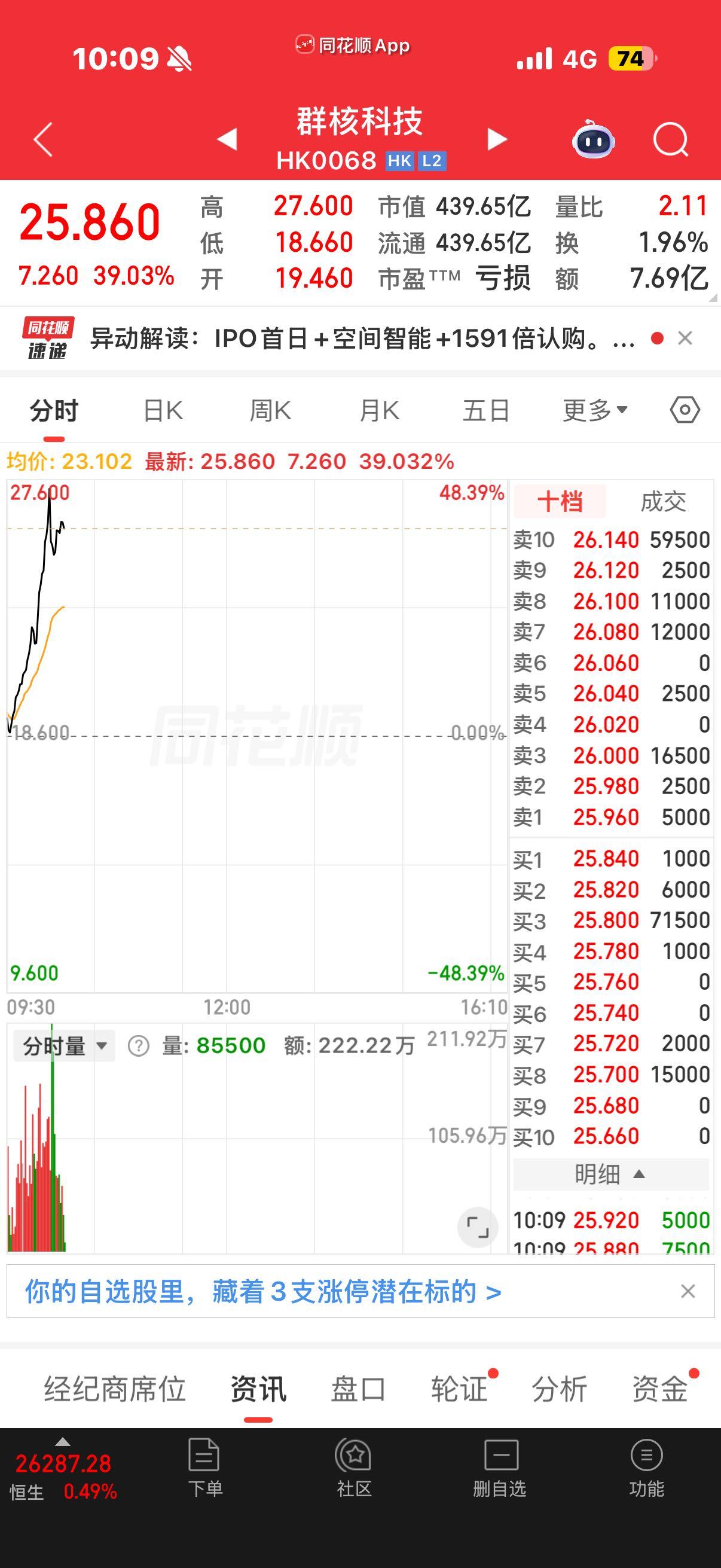 4月17日,杭州群核信息技术有限公司正式在港交所挂牌上市,成为“杭州六小龙”中首家完成IPO里程碑的科技企业,亦成为“全球空间智能第一股”。今日开盘,群核科技涨182.15%,报21.50港元/股,市值365.52亿港元。上市是新征程的开始。”群核科技董事长黄晓煌表示,“所募资金将主要用于深化空间智能核心技术研发与生态建设。”